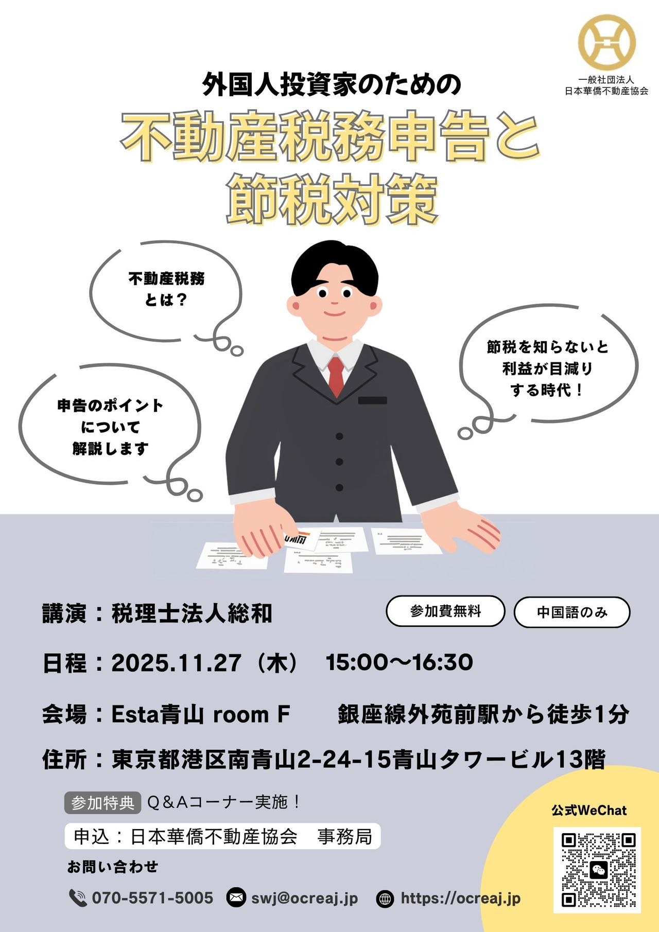 日本華僑不動産協会では、外国籍投資家の方向けに「不動産税務申告と節税対策」をテーマとした税務セミナーを開催いたします。